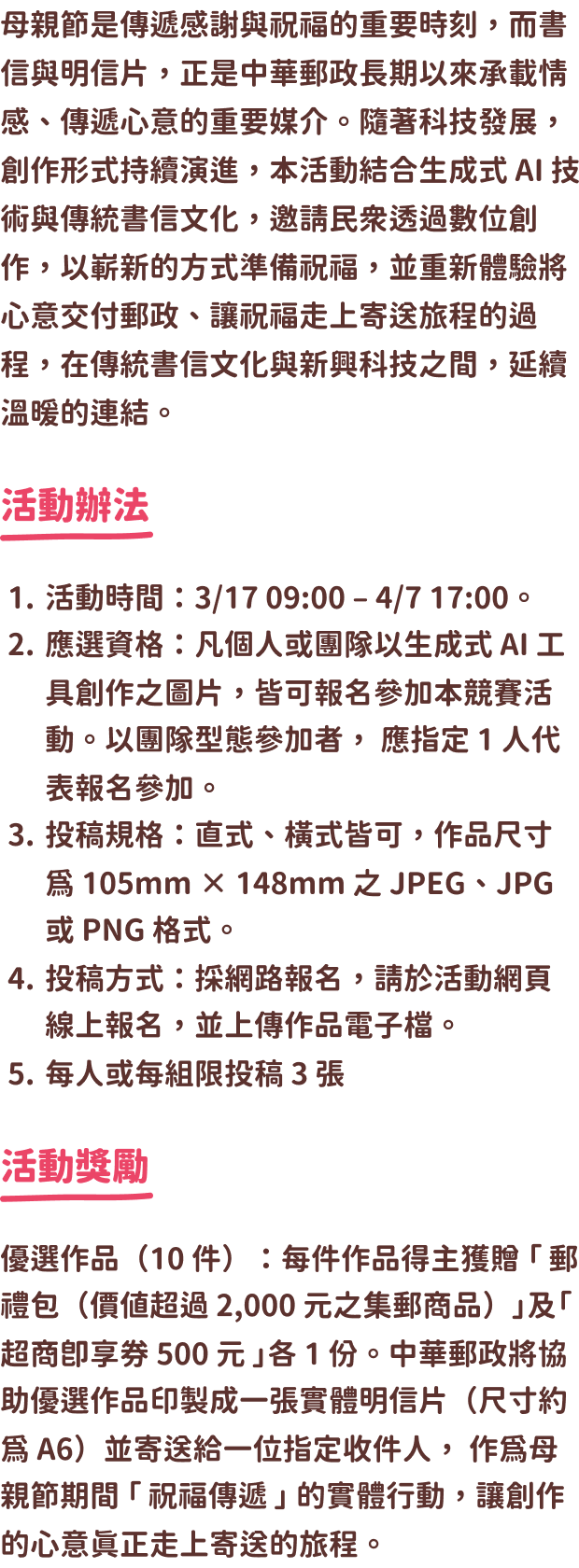 中華郵政將協助優選作品印製成一張實體明信片(尺寸約為 A6)並寄送給一位指定收件人,作為母親節期間「祝福傳遞」的實體行動,讓創作的心意真正走上寄送的旅程。